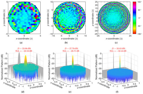 To demonstrate that the beam-adaptation characteristic does not hinder the search ability of the algorithm, single-beam patterns with different aperture diameters were synthesized using both our proposed AIFT and the MIFT [33], while the MIFT can be considered as a version of AIFT without self-adaptation functionality. The single-pencil-beam patterns synthesized by AIFT and their corresponding phase distributions are presented in Figure 5. The -diameter circular array contains 253 elements, the array has 1015 elements, and the array has 6307 elements. In all three cases, roughly uniform energy distributions are achieved in the SLRs, indicating that the minimum SLLs obtained by AIFT are either local optima or at least very close to local optima [17].