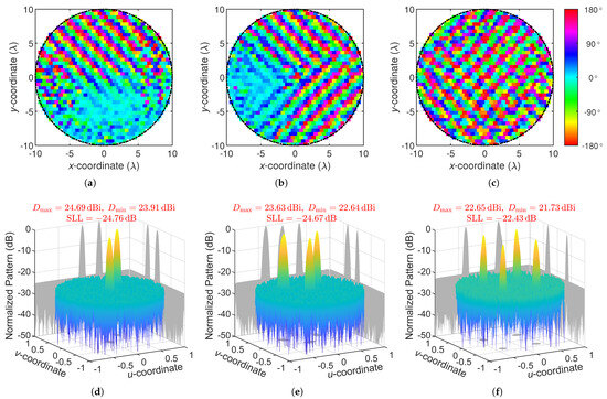 Phase distributions (a–c) corresponding to the synthesized multibeam pattern of beams (d) ⓪①, (e) ⓪①②, and (f) ①②③④, respectively.