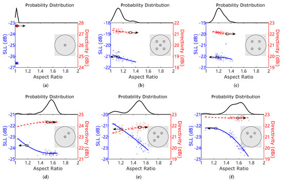 Notably, a secondary peak emerges around in both cases, corresponding to smaller aspect ratios, as illustrated in Figure 8f. This suggests that the algorithm sometimes stagnates at lower ellipticities, forming broad and deep local optima. To address this, a simple yet effective solution is to impose a lower bound on the beam aspect ratio, ensuring AIFT consistently generates highly elliptical beams with minimized SLLs. Specifically, for highly asymmetrical configurations with fewer than three symmetry axes, we recommend constraining the aspect ratio to a higher range (e.g., ), which enhances robustness and prevents convergence to local optima associated with near-circular beams. For more symmetric configurations with more than three symmetry axes, limiting the aspect ratios to a lower range (e.g., ) can promote faster convergence while maintaining optimal performance.
