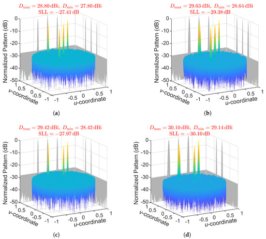 It is worth emphasizing that the sidelobe level is the maximum value of for all the points in the SLR and the non-smooth points in the MBR. The above three pattern constraints can guarantee multiple smooth pencil beams while maximally preserving the freedom of adaptive MBRs. With all pattern constraints applied, the beam centers of the synthesized pattern will lie exactly in specified directions, and the deviation will not exceed the grid size of the u-v plane in which it is being synthesized.