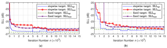 The overall synthesis consists of several rounds of iterative processes, with K progressively increased round by round. At the beginning of each iterative process, the counter for a single and the iteration number n will be set/reset to 1. In practice, we found that initialized to 2– would be a good choice for the most part. The reduction factor , which determines the decreasing speed of , is set larger (e.g., 0.7) for the initial smaller-K iterative process to allow for more iterations in search of better results. For subsequent larger-K iterative processes, is set smaller (e.g., 0.5) to reduce iterations and save time. The variables , , and are initialized in the first iteration of each iterative process as , , and , respectively. They will approach better results through the iterative process and will be updated with higher resolution as K increases. The suggested values for some constant parameters are as follows: , , , and . Decreasing , , or , or increasing will reduce the number of iterations required for convergence; however, this may also decrease the likelihood of achieving lower SLLs.