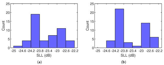 Histograms of synthesized SLLs for beam set ⓪①② on a -diameter array over 50 runs with (a) a uniform initial phase distribution and (b) a random initial phase distribution.