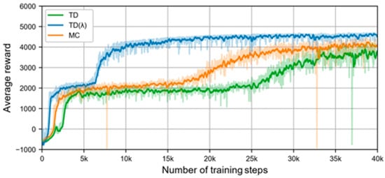 As mentioned in Section 3.2, 3 different agents were trained using TD, TD , and MC. For TD training, the value of was set to 0.95. Each of these agents is trained in 3 different scenarios: