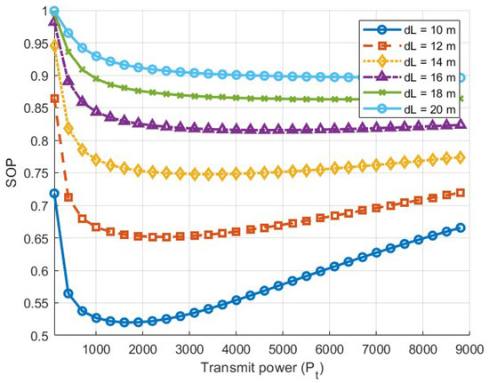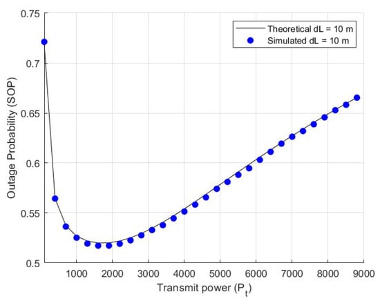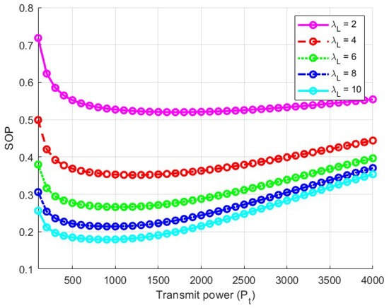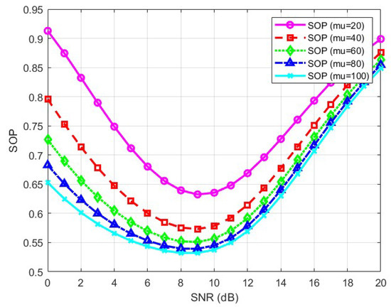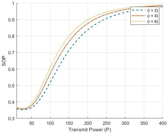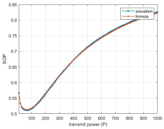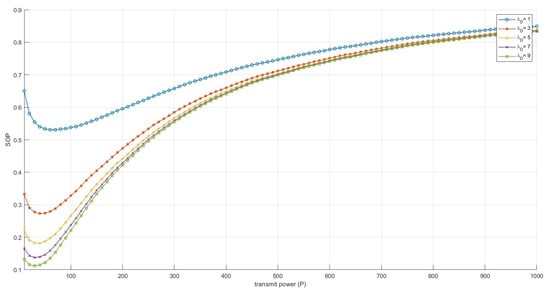 The simulation results are shown in Figure 10, which indicates that the derived formula is correct. When the communication link is being eavesdropped on by multiple users, the transmission power should not be too high. Additionally, SOP increases as the number of eavesdropping users rises. As mentioned earlier, when the transmission power is low, legitimate users are unable to obtain highly accurate information. Therefore, it is necessary to design the transmission power reasonably to ensure that both message accuracy and security are maintained at a high level.