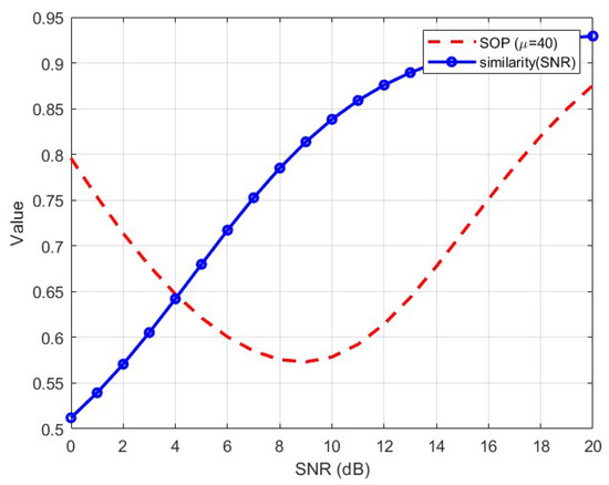 Considering that legitimate users can always choose the best channel for transmission, we analyzed the changes in the secrecy outage probability (SOP) under different values of , as shown in Figure 4. It can be concluded that if the legitimate channel improves, the security performance increases. At the same time, as the legitimate channel improves, the optimal transmission power required to achieve the best security performance will also decrease. By running the DeepSC tool, we can obtain the relationship between semantic similarity and SNR under a fixed K condition, while also analyzing the changes in semantic similarity and SOP when , as shown in Figure 5. It can be observed that semantic similarity cannot reach its optimal point simultaneously with SOP. Therefore, we employ the semantic reliability index to evaluate the overall performance of the semantic communication system, described as follows: