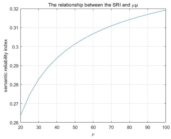 Figure 6 shows the variation in SRI as a function of . Overall, compressing semantic information improves the SRI index; however, under the assumed conditions, the SRI is relatively low. This is because, when the SNR is low, the system’s effectiveness is not well guaranteed. As the SNR increases, semantic similarity gradually rises, but at that point, security performance significantly decreases.