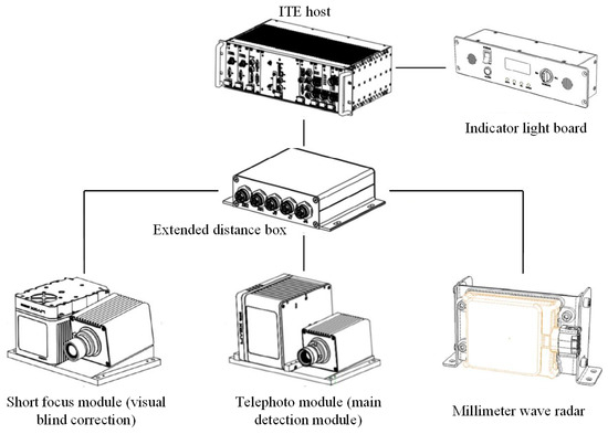 The schematic diagram of the ITE system is shown in Figure 1. The hardware components of the ITE system include an ITE host, a telephoto module (telephoto camera + LiDAR), a short-focus module (short-focus camera + LiDAR), and a millimeter-wave radar. The sensors connect to the ITE host via range extension boxes, and an indicator light panel serves as an interactive terminal connected to the ITE host.