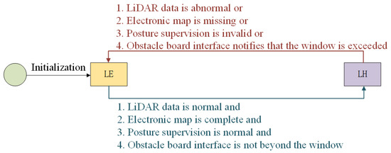 The ITE system has two operating modes: level exploration (LE) mode and level high-precision (LH) mode. The system switches between these modes automatically. Initially, the ITE operates in LE mode. Once the system completes high-precision positioning initialization, it transitions to LH mode. If the system receives Intelligent Train Positioning (ITP) information indicating an abnormal position window, direction deviation, or other irregularities, the ITE system switches back to LE mode. The mode transition relationships and conditions are illustrated in Figure 2.