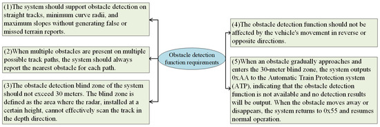In order to ensure the reliability and safety of autonomous train operation, the ITE system must have high-safety obstacle detection capabilities to ensure accurate obstacle identification and implement appropriate response measures in complex environments. This enables it to replace manual monitoring while ensuring reliable detection and early warning capabilities. Consequently, it meets the requirements of train control systems. Based on the requirements of the train control system for the ITE system, its specific functional requirements can be further refined, as shown in Figure 3.
