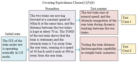 Based on the equivalence class division table, test cases are designed for different situations. There are two scenarios: the dynamic tracking of two vehicles and a static vehicle. The test cases are shown in Figure 6. TOSD in the figure stands for “Test Of System Data”, the online data playback system of the ITE system.