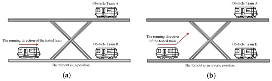 Test Cases 3 and 4 consider the scenario with multiple obstacles and test the ITE system’s ability to assess the rail boundaries. The train passes through the turnout in the fixed position, as shown in Figure 7a, and in the reverse position, as shown in Figure 7b.