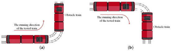 Test Cases 5 and 6 evaluate the ITE system’s ability to detect an obstructing train in a curve. The top view of the scene where an obstructing train stops at a curve is shown in Figure 9. The obstructing train stops at a left curve in front in Figure 9a, and the obstructing train stops at a right curve in Figure 9b.