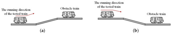 Test Cases 7 and 8 evaluate the ability of the ITE system to detect train obstacles in ramp scenarios. Figure 11 shows the schematic diagram of train obstacle detection in ramp scenarios. The scene with a train obstacle on the uphill ramp ahead is shown in Figure 11a, and the scene with a train obstacle on the downhill ramp ahead is shown in Figure 11b.