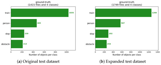 We tested the model by using an expanded dataset to better account for various real-world situations. By applying image transformations to the original dataset, such as adding images with motion blur, rain, snow, fog, and other adverse weather conditions, all possible scenes were incorporated into the original dataset. The total number of objects in each category of the final original test dataset and the expanded test dataset is shown in Figure 15.