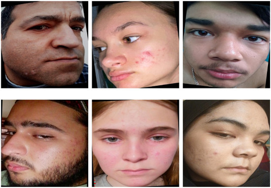 This research utilizes a dataset of facial images with skin issues focused on the facial region, compiled from three primary sources to ensure diversity and comprehensiveness. The main dataset, titled “Skin problems (3-4 on the IGA scale)” by Kucev Roman, was sourced from Kaggle [48]. Additionally, two supplementary datasets—“Face Segmentation” and “Selfies and Video Dataset (3673 People)”—were also obtained from Kaggle and provided by Kucev Roman [49,50]. This combined dataset includes 710 images of individuals captured from three different angles under controlled lighting, without makeup or other extraneous facial features. The entire dataset, totaling approximately 2.37 GB, was manually annotated in preparation for subsequent stages.