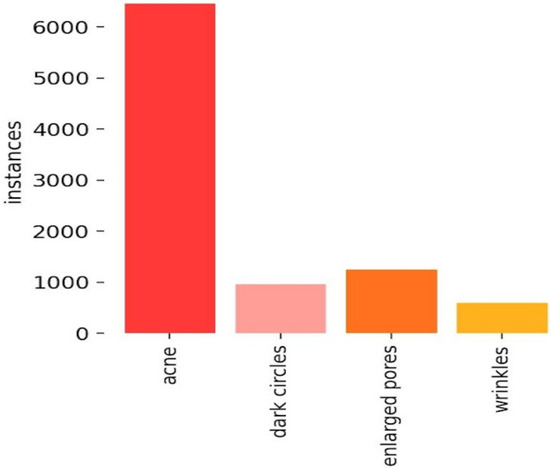To further illustrate the dataset structure, Figure 2 displays the class distribution post-augmentation. The dataset contains over 6000 bounding boxes for acne, with other classes such as dark circles, enlarged pores, and wrinkles each comprising around 1000 bounding boxes.