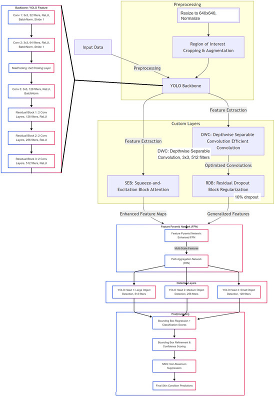 To enhance feature representation and improve model robustness in resource-constrained environments, we integrated three custom layers: SEBlock, DepthwiseConv, and ResidualDropoutBlock. These layers were selected to optimize the model’s performance while maintaining efficiency for real-time skin condition detection. SEBlock (Squeeze-and-Excitation Block) was incorporated to apply channel-wise attention, enabling feature recalibration by assigning higher importance to the most relevant channels while suppressing less informative ones. This mechanism is particularly beneficial for dermatological applications, where small texture variations in skin conditions can be critical for accurate detection. Depthwise Separable Convolution (DepthwiseConv) was employed to decouple spatial and channel-wise computations, significantly reducing the number of parameters and computational cost without sacrificing accuracy. This structural optimization ensures that the model remains lightweight and efficient, making it well suited for real-time deployment in embedded environments. To mitigate overfitting, we introduced the ResidualDropoutBlock, which incorporates stochastic regularization while preserving residual connections. This technique enhances the model’s ability to generalize effectively, particularly when trained on limited dermatological datasets, by preventing excessive reliance on specific features and encouraging more diverse feature learning.