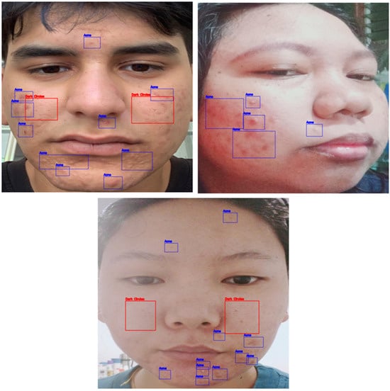 The growing body of research utilizing YOLO models extends beyond single-condition classification. For instance, ref. [42] applied YOLOv8 for acne grading, achieving high differentiation between acne types, while ref. [43] proposed an enhanced YOLOv7-based acne detection model with improved feature extraction. Additionally, ref. [44] introduced a deep neural network-based acne detection framework, demonstrating effectiveness across various skin tones and lighting conditions. Other studies have explored optimization-based approaches for broader dermatological analysis. Ref. [45] incorporated multi-modal data into a CNN-based framework to enhance facial skin symptom detection, whereas ref. [46] focused on distinguishing benign pigmented skin lesions using CNNs.