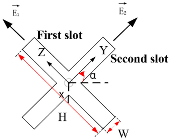 The radiation slots of the omnidirectional circularly polarized (CP) antenna are illustrated in Figure 1. In the antenna design, radiation is achieved through a pair of X-shaped slots arranged in 180° rotational mirror symmetry around the central axis of the circular waveguide. These slots are oriented with an angular separation of 45°, and their close proximity enables an approximation of 360° omnidirectional radiation coverage. According to the operating principles of slot antennas, the slots act as equivalent magnetic current sources when excited. The effective length of such slots is typically defined as the vertical projection relative to the feeding direction. Consequently, the slot length in this design is optimized to half the operating wavelength [15], ensuring impedance matching and efficient radiation. The mechanism of circular polarization generation is shown in the following diagram: