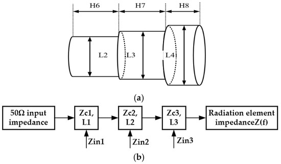 Overall impedance of the antenna: (a) Schematic diagram of coaxial cascade (b) Schematic diagram of overall impedance matching of the antenna.