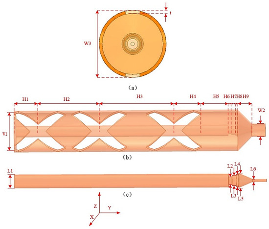 The designed antenna structure is shown in Figure 3. Figure 3a represents the bottom outline of the antenna, Figure 3b represents the main view of the overall structure of the antenna, and Figure 3c represents the structure diagram of the internal coaxial structure. The antenna is a circular polarization omnidirectional antenna designed based on the main structure composed of a circular waveguide and a truncated cavity. The packing material between the inner and outer conductors is polytetrafluoroethylene, whose relative dielectric constant and the overall wall thickness of the waveguide t = 2 mm. The whole antenna structure can be divided into three parts, namely, the X-shaped radiation unit, the stepped coaxial matching section and the conical line feeding section. The length and width of the X-shaped radiation unit correspond to the parameters H and W, respectively, in Figure 1. Based on the coaxial line transmission impedance theory, three sections of coaxial impedance with different characteristics were designed to achieve impedance transition and reduce signal attenuation. The conical line feed part uses a flat truncate to connect the SMA interface to the impedance matching section, so that the small size feed port is connected to the large matching section without changing the impedance, and the loss caused by the size change is reduced. The structural dimension parameters of each part are shown in Table 1: