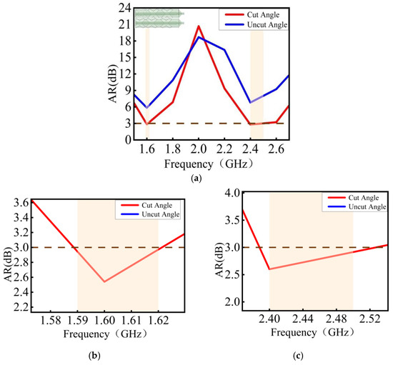 Since the coaxial end of the feed is connected to the waveguide wall, forming a short-circuit structure, the X-shaped gap is treated with a cutting angle at the end of the antenna, which can optimize the impedance at the end of the antenna, so that the coaxial line of the shorted end is equivalent to an impedance matching device under the action of the X-shaped gap at the cutting angle, further reducing the reflection of the end signal and preventing the formation of standing waves [15]. During the antenna simulation testing, a comprehensive comparison was conducted between the corner-truncated and non-truncated models in terms of axial ratio (AR) performance, as illustrated in Figure 4a. The upper-left corner presents a comparative schematic of the two simulation configurations. The truncated design demonstrates AR values approaching 3 dB within both 1.6–1.62 GHz and 2.4–2.5 GHz bands, with the yellow-shaded regions (1.59–1.62 GHz and 2.4–2.5 GHz) effectively covering the predetermined operational frequency bands. To intuitively demonstrate the AR characteristics in uplink/downlink frequency ranges, magnified views of the truncated model’s corresponding bands are provided in subfigures (b) and (c). Comparative analysis reveals that the truncated configuration exhibits significantly mitigated performance degradation relative to the non-truncated counterpart, achieving superior circular polarization characteristics. This improvement is particularly evident through reduced AR fluctuations and enhanced stability across targeted spectral regions, confirming the efficacy of corner truncation in optimizing polarization purity for dual-band antenna operation.