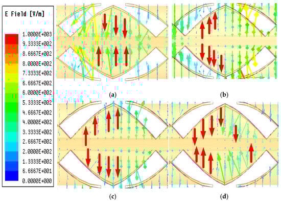 In order to further understand the electric field distribution around the gap, assuming a period of T and a phase of 360 deg, the electric field distribution around the gap at 0, T/4, T/2 and 3T/4 is shown in Figure 5, which shows the specific process of radiating circularly polarized waves. The electric field is opposite at 0 and T/4, and at T/2 and 3T/4.