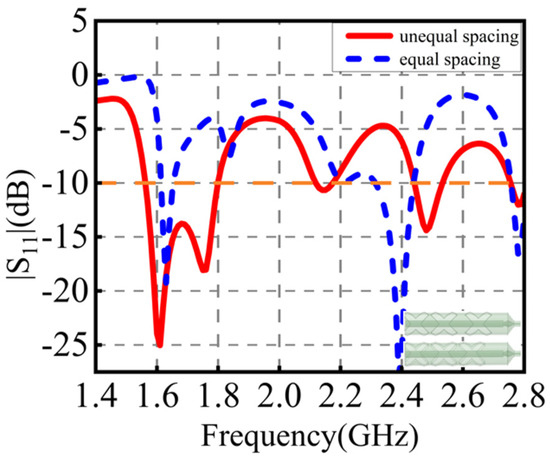 Based on the principles of antenna array design, equidistant spacing of array elements (typically half-wavelength) was conventionally adopted to ensure in-phase radiation from the slot elements. However, in this design, the corner-truncated slots at the array terminals alter the radiation environment, necessitating a deviation from the strict half-wavelength spacing criterion. Additionally, due to the polytetrafluoroethylene (PTFE) filling between the inner and outer conductors, the effective inter-element spacing was reduced to 70% of the original design. To mitigate transmission line losses in the L- and S-bands, which cause progressive power attenuation along the coaxial feed, the element spacing was judiciously optimized to enhance radiation performance. Figure 6 compares the reflection coefficient (S11) of two configurations, an equidistant array (element spacing = 65 mm, corresponding to a half-wavelength at the target frequency) with a non-equidistant array (terminal-to-middle element spacing H2 = 65 mm and adjacent spacing H3 = 75 mm).