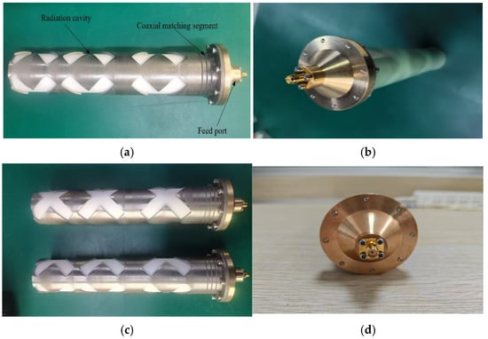 The simulated antenna in Figure 3 was fabricated into a physical prototype. To address the wide slot dimensions and small waveguide diameter, the cavity material was changed from an aluminum alloy to stainless steel to enhance its structural rigidity. Considering the harsh marine environment’s impact on communication performance, a corrosion-resistant fiberglass-reinforced polymer (FRP) radome was integrated into the housing. This radome ensures excellent electromagnetic transparency while prolonging the antenna’s operational lifespan. The radome covers both the slot radiation region and impedance matching section, with additional potting encapsulation applied to seal critical components. The housing structure employs riveted connections between the feeding port and impedance matching section, as detailed in Figure 7.