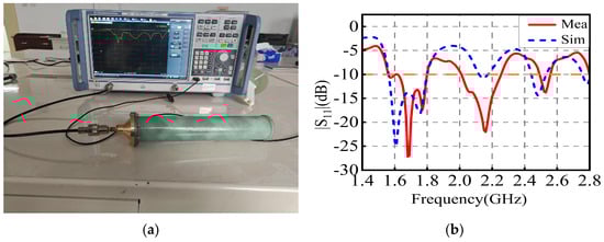 The antenna was connected to a vector network analyzer to obtain the parameters |S11|. The axial ratio and direction pattern of the antenna were tested in a microwave darkroom, and the simulation and measured data of the antenna in the 1.4–2.8 GHz band were obtained, as shown in Figure 8. Among them, the measured S11 of the antenna is roughly consistent with the simulation data, and the measured antenna data are shown in Figure 8a. The range of |S11| ≤ −10 dB is 1.59–1.84 GHz and 2.48–2.55 GHz, both of which include the upstream and downstream frequency bands of BeiDou-1.