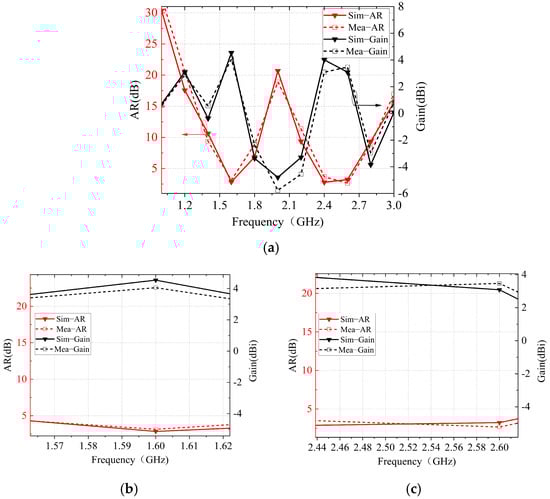 Comparison data of measured axial ratio and gain of the antenna: (a) 1–3 GHz; (b) 1.56–1.62 GHz; (c) 2.44–2.62 GHz.