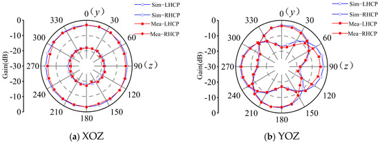Polarization gain of the antenna at 2.49 GHz (a) XOZ (b) YOZ.