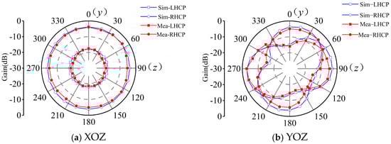 Figure 10 and Figure 11 show the left-right circular polarization gain of the antenna at 1.62 GHz and 2.49 GHz, respectively. It can be found that the measured right-right circular polarization gain of the antenna at the two frequency points has a higher coincidence degree with the simulated gain, and it has good omnidirectional radiation characteristics. The main reason for the actual field distribution being different from the simulation environment is the different materials used for the antenna feed end and the radiation end at the riveting joint. The second reason for the difference is the limitation of the dimensional accuracy of the antenna gap during processing.