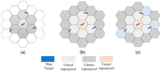 During the local CFAR phase, it is essential to accurately identify and eliminate the clutter superpixels that persist after the global CFAR detection. In order to estimate the clutter parameters, a local CFAR detector should be constructed first to identify the background superpixels. Two popular approaches for acquiring background superpixels for threshold estimation are shown in Figure 2: the neighborhood superpixel approach suggested in [12] and the superpixel-level sliding-window technique detailed in [11]. A comparison of Figure 2a,b shows that the sliding-window strategy demonstrates superior mitigation of cross-contamination risks from neighboring target superpixels, despite its requirement for extended computational resources. While the neighborhood approach maintains computational efficiency through limited superpixel engagement, this approach may introduce bias in clutter characterization, particularly in complex environments with heterogeneous clutter distributions. Conversely, the sliding-window technique enhances environmental representation by adjusting the size of the window, thereby improving the robustness of the model at the cost of increased algorithmic complexity.