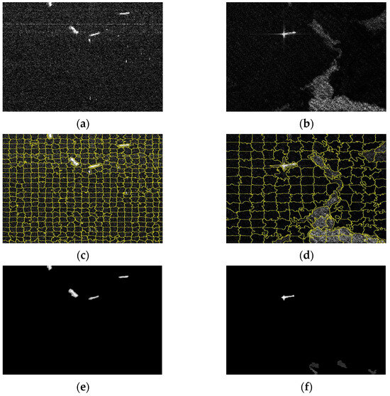Figure 5c,d demonstrates the segmentation results of the SLIC algorithm on SAR images. For single-channel SAR images, the superpixels generated by the SLIC algorithm effectively adhere to image boundaries, with targets and coastlines being accurately segmented. Moreover, most of the superpixels are homogeneous. As shown in Figure 5e,f, the local contrast analysis demonstrates that the target is enhanced due to its local saliency, while both land regions and highlighted background areas are completely suppressed. The comparative results are shown in Figure 5g–n. The detection results for OS-CFAR are shown in Figure 5g,h, where it is observed that the target area contains fractures and holes, together with a significant amount of noise in the background. Similarly, the detection results for SP-CFAR are shown in Figure 5i,j, where speckle noise is suppressed, but the target boundaries are not well preserved, especially at the boundaries. Figure 5k,l show the detection results of the TS-SP-CFAR. Although all targets are correctly detected, there are still some false alarm pixels present. Compared to the detection results of the aforementioned methods, the performance of the proposed method shows a significant improvement, as illustrated in Figure 5m,n. It can be seen that false alarms, primarily caused by the presence of reefs, are consistent across all detection results. However, the proposed method has the lowest false detections with the same Pfa while also preserving the shape of the targets effectively.