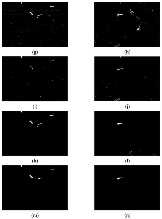 The definition follows a similar form to Equation (2), substituting the original patches u1 and u2 with the target superpixel Sm and its neighboring Sn, and represents the dissimilarity between superpixels. Here, represents the pixel’s local variability, where and represent the variance and mean of the region, respectively, while k is the spatial factor, which is set to 0.6, and local area size is set to 5 pixels × 5 pixels. According to Equation (13), for true target superpixels in , both and exhibit larger values, resulting in a higher Q. Conversely, for land superpixels in , smaller and lead to a reduced Q. For the issue of reduced local contrast in target superpixels in caused by high-intensity neighboring superpixels in , we remove these interfering superpixels based on their index identified through global CFAR detection, thereby preserving the local saliency of target superpixels. It demonstrates that local contrast significantly enhances the detectability of potential ship targets by amplifying their distinctiveness against complex backgrounds.