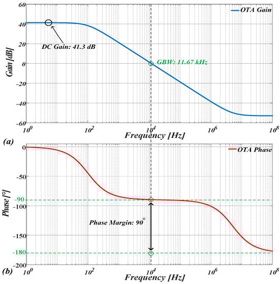 Frequency response of the OTA in Figure 3 (a) gain, (b) phase.