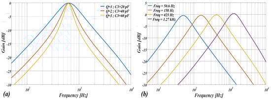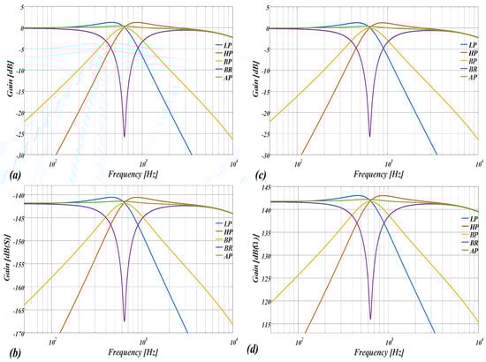 According to Equation (15), the filter gain for the band-pass filter in voltage mode at the center frequency is as follows, in which replaces ‘s’:
