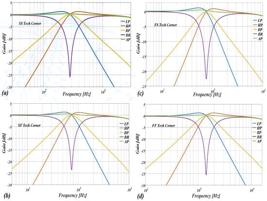 Filter’s frequency response for different filtering modes and for (a) SS corner, (b) SF corner, (c) FS corner, (d) FF corner.