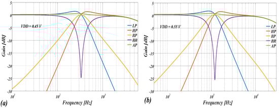 Filter’s frequency response for different filtering modes for (a) VDD = 0.45 V, (b) VDD = 0.55 V.