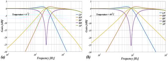 Filter’s frequency response for different filtering modes for temperature of: (a) T = 0 °C, (b) T = 40 °C.