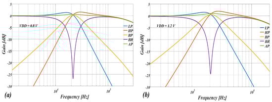 Filter’s frequency response for different filtering modes for (a) VDD = 0.8 V, (b) VDD = 1.2 V.