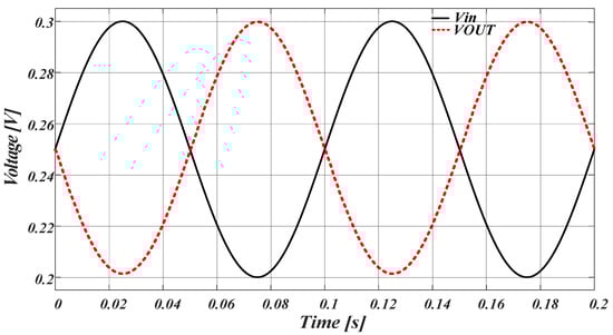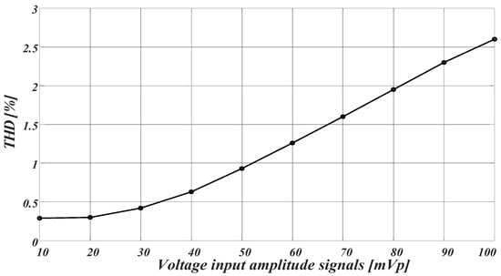 Moreover, to investigate the linearity performance of the low-pass filter, different sinusoidal input voltages at 10 Hz are applied, and the respective variation of the total harmonic distortion (THD) is shown in Figure 11. The transient input and output low-pass responses are illustrated in Figure 12 by using a 50 mVP sinusoidal input at 10 Hz. The THD value of the proposed filter at the 50 mVP input is 0.93%.