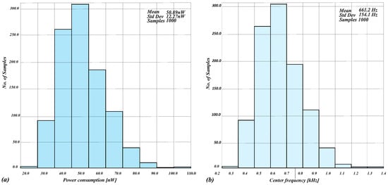 Monte Carlo analysis for the proposed band-pass filter: (a) power consumption, (b) center frequency.