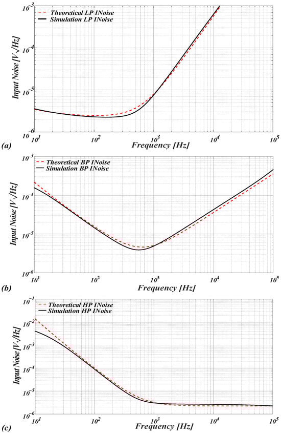 Comparison between simulation and theoretical input noise for different filtering responses: (a) low-pass, (b) band-pass, (c) high-pass.