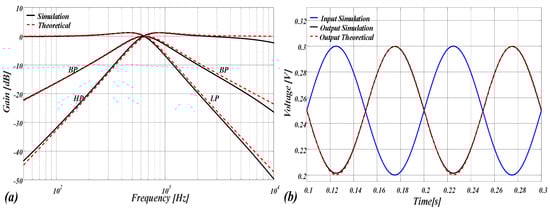 Furthermore, Figure 16 compares the simulation and theoretical results for the filtering and transient responses. The theoretical center frequency for the band-pass filter at the capacitance values 20 pF is 661 Hz, while its simulation center frequency is 635 Hz.