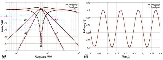Pre-layout and post-layout simulation results comparison: (a) filtering responses, (b) transient responses.