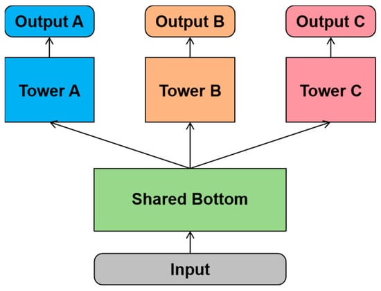 where yi is the output of the ith task, x is the input data, θf is the parameters of the shared feature extraction layer, and θti is the parameters of the ith task tower. When the parameters are shared between the tasks through the weight matrix, there is the following equation: