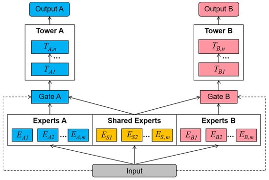 Multi-task learning (MTL) can effectively reduce the above problems. At present, a large number of studies have been carried out on the prediction and classification of new energy power generation. For example, reference [] proposes a short-term prediction method for offshore wind power based on the classification of significant weather processes and multi-task learning considering adjacent power. The power sequence of adjacent offshore wind farms is introduced as a new input feature to model wind power prediction for each wind farm in the adjacent region under each category of weather processes. Reference [] combines the high computing power of deep neural networks (DNNs) with the improved generalization performance of MTL to design separate output layers for each task and provide them with shared representations to solve the related problems of wind ramp event prediction in wind farms. Different variants of MTL have also been developed, such as Multi-gate Mixture of Experts (MMoE). Reference [] combines WaveNet, a special type of Convolutional Neural Network, with the architecture of MMoE, aiming to overcome inherent limitations by efficiently capturing and exploiting complex patterns and trends in time series data. However, the MTL models used in the current research have, more or less, the inherent negative transfer problem and the “see-saw” problem; that is, when the correlation between different tasks is weak, the joint training effect is not good, or the effect of one task is sacrificed to improve the effect of another task.