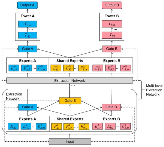The PLE can be thought of as consisting of multiple layers of CGCs connected together, and its structure is shown in Figure 5. PLE further classifies Gated Networks into a Task-Specific Gate and a Shared Gate as well. PLE consists of multiple Extraction Networks, and each Extraction Network is the CGC network layer. The inputs to the first Extraction Network layer are the inputs to the native model, and each Extraction Network layer, except the last one, contains only the Experts Network and the Gate Network, but there is a unique Shared Gate Network, which is used to aggregate the information from all the Experts in this layer and provide it to the next layer for use. The last layer of the Extraction Network contains the tower network corresponding to each task and the output layer. The structure of the multilayer CGC also provides for interaction between upper-level Experts and lower-level Experts, enabling the extraction of deeper information.